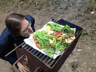 The only additional ingredient you need is about a half-cup of seitan. Place the stuffed mushrooms--stuffing, tomato, and all--in the food processor with some seitan and process until smooth. Make two-inch burgers and grill them with some vegetables. I can totally see taking the mix to a picnic, in a tupperware, and forming and grilling the burgers in situ.